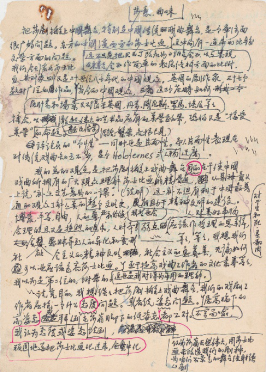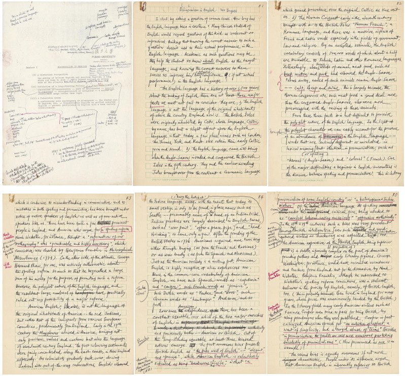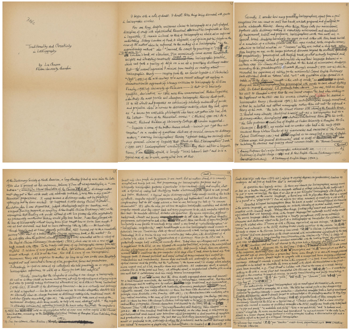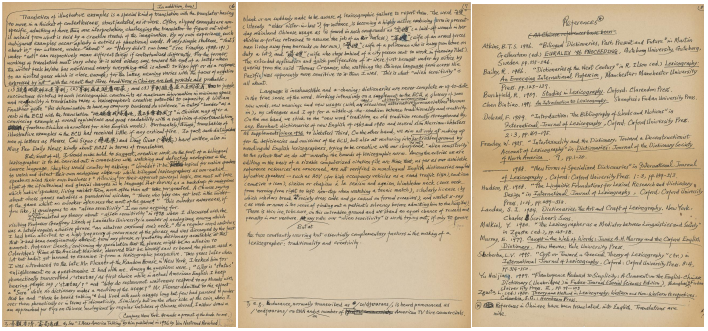 从现存的审稿手迹中可以看出,用“呕心沥血”来形容陆老师编纂词典的态度也不为过。几乎没有一页的边缘没有陆老师密密麻麻的手写评注、增补、格式修改建议、优化提议(见本展柜手稿第2页左栏关于“词格分裂”的说明)。陆老师认为词典是给当下的世人用的,汉英词条的翻译需要与时俱进,哪怕像“铲车”(forklift, track)这样不起眼的单词,也会建议添上bulldozer等不同语境下可能适用的另类译法(本展柜第1页左栏),甚至费尽心思为新语境中同一个汉语单词“创造”新的英语译法供词典工作组成员商榷。陆老师编纂词典的态度可谓将谨小慎微与锐意创新都做到了极致。