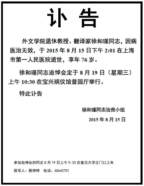 外文学院退休教授徐和瑾同志讣告