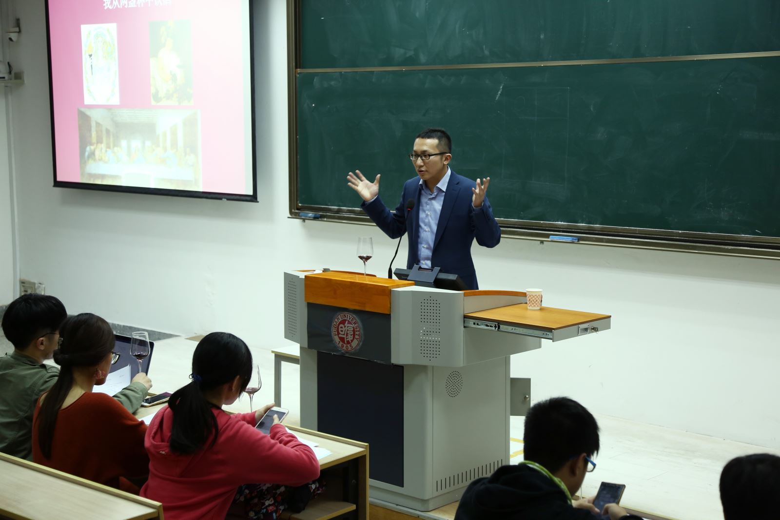 11月21日,外院中澳创意写作中心“沙仑的玫瑰”与青年教师联合会在6212主办了一场别开生面的学术讲座。以“诗歌中的葡萄酒”为主题,“沙仑的玫瑰”三位主要成员,法文系陈杰老师、德文系姜林静老师和英文系包慧怡老师,跨三个语种为大家解读了三首诗歌,并特邀ITASTE“意味葡萄酒”总监叶文先生为每一首诗歌配一款意境和色彩相符的葡萄酒并介绍背后的文化。不仅如此,现场所有学生都拿到了水晶酒杯,在细看和聆听老师们解读“金黄、矿紫、绛红”主题的三首诗歌的同时,用嗅觉和味觉切实品尝到了三支相应色泽、精心挑选的葡萄酒。难怪H6212室提前十分钟就被热爱诗酒的120多名同学们挤得水泄不通,若不是伺酒需要隔开一行入座,现场可能还会更加拥挤。