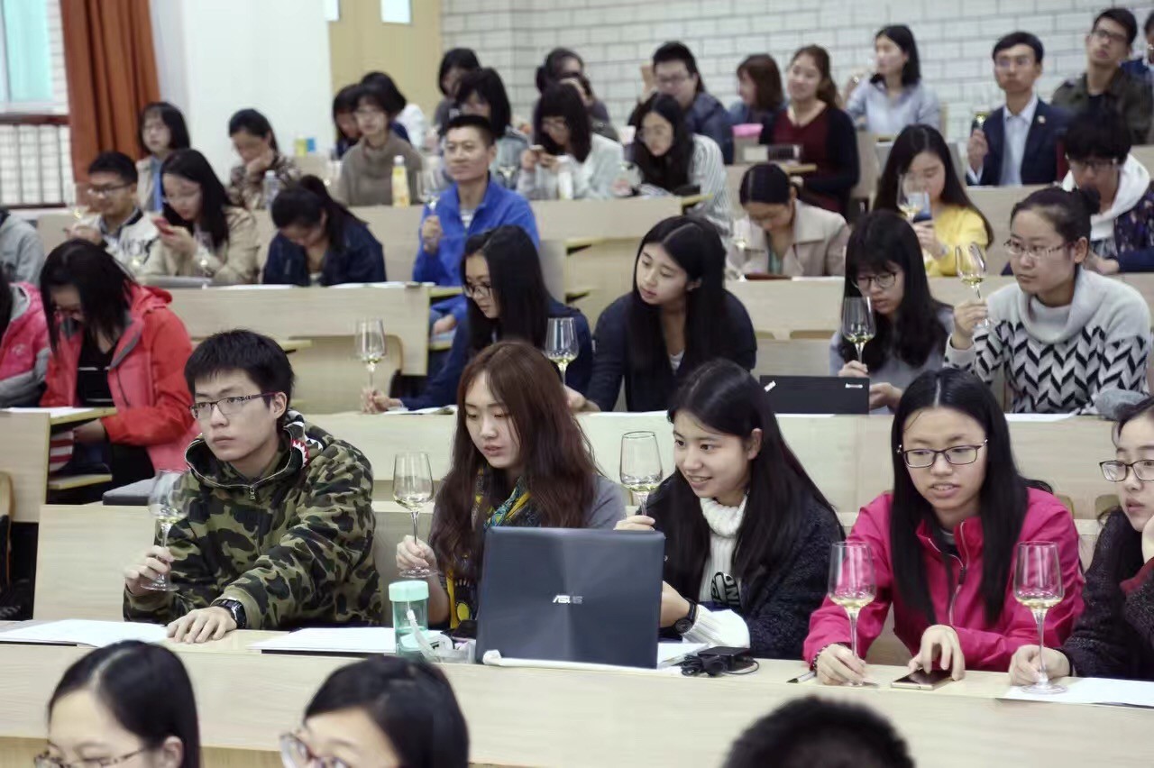 临近下课,窗外已是天昏地暗、秋雨滂沱,但意犹未尽的同学们无人离场,似乎觉得这场诗酒盛宴还不够过瘾。学生李逸凡在讲座结束不到四小时就在自己的微信公号发出了讲座速递,并收集了现场众多同学发出的听课感受,“美酒与诗歌的碰撞让我在忙碌的生活中感受到美学层面的崇高,使我得意短暂地超脱生活本身去静观生活”;“听着老师充满磁性的朗诵和透彻的解析,回味嘴里的苦涩和酸甜,隐隐能感受到诗中晦涩的隐喻和诗意的境界”;“下次又会是什么诗什么酒呢?”