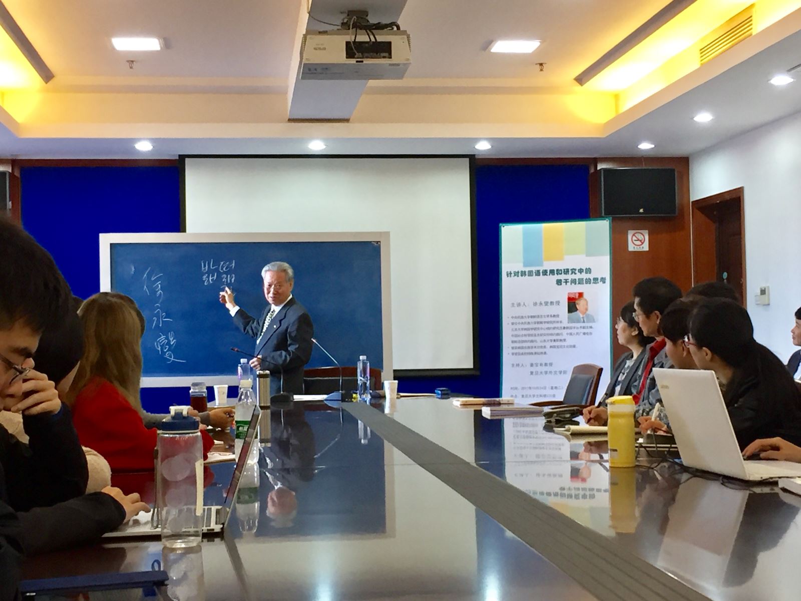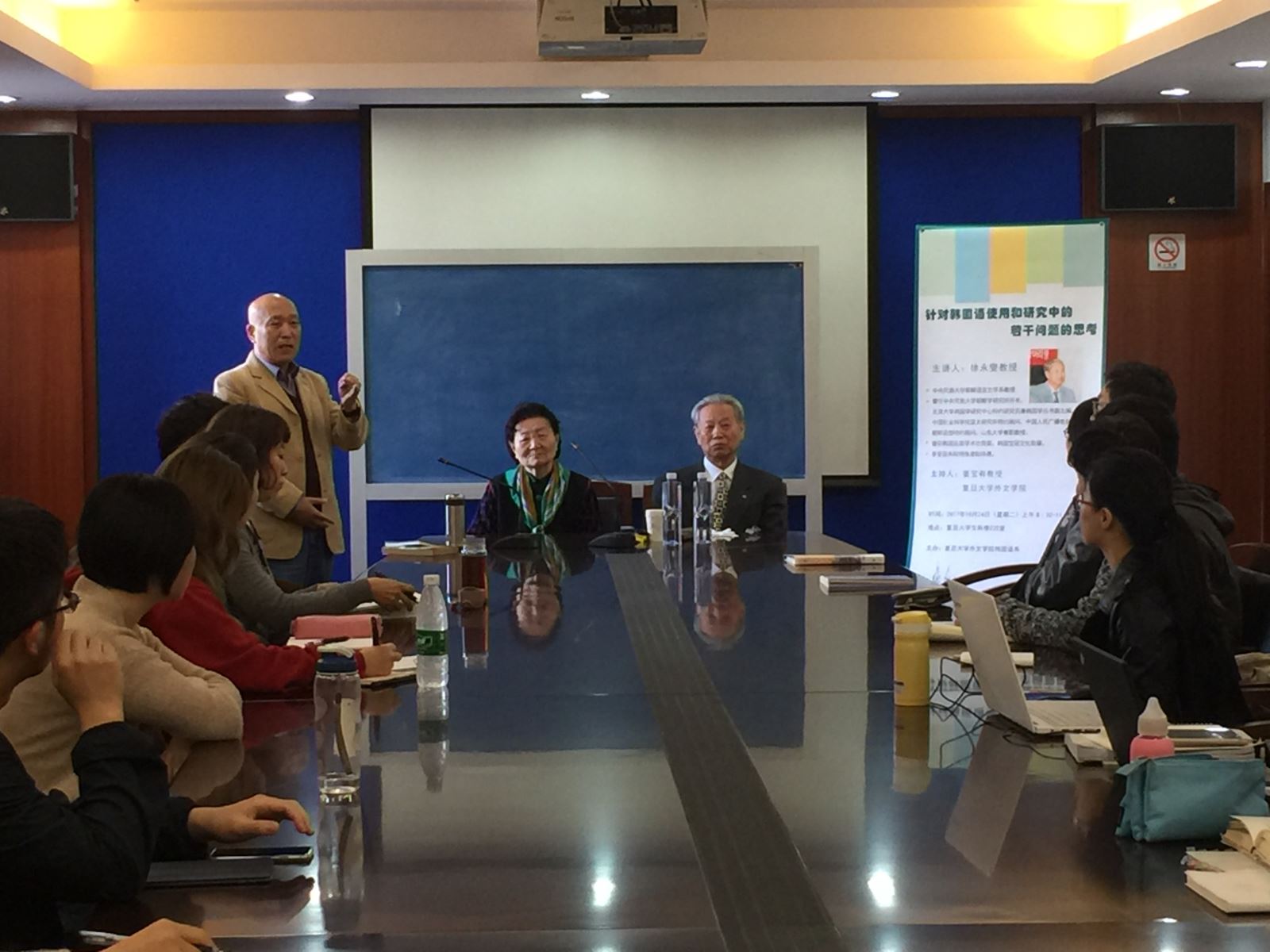 徐教授从韩国语的发音入手,通过详实多样的举例,阐释了韩国语音韵的几点特殊性。随后,徐教授又从韩国语语法的角度进行阐述,对比了朝鲜语和韩国语的差异,引发在场听众的思考。最后,徐教授强调了韩文字的优秀性,使得韩国语学习者们备受鼓舞。