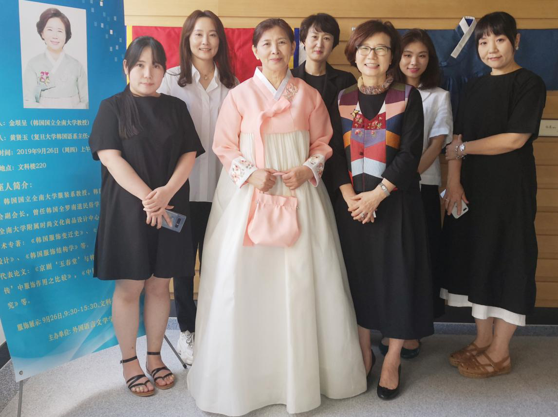 2019年9月26日,韩国国立全南大学教授金垠呈应邀前来Uwin电竞,Uwin电竞(中国)外文学院做了主题为“韩国服饰文化变迁史”的讲座,随行的五名博士生准备了精美的韩国服饰展,展示了韩国各历史时期的服装,从而让学生们更加近距离的接触了解韩服、体验韩国文化。