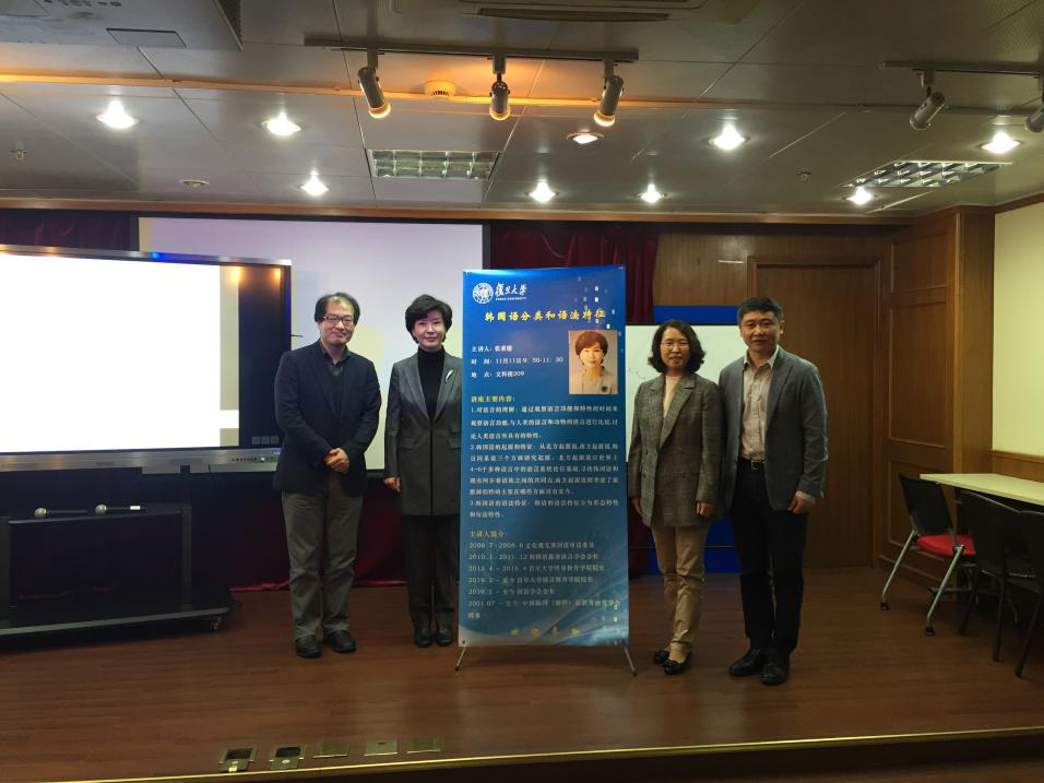 在上午的第一个讲座中,张素媛教授首先介绍了自己对语言的理解,通过人类的语言和动物的语言比较,讨论了人类语言所具有的特性;其次从北方起源说、南方起源说、韩日同系说三个方面探讨了韩国语的起源和特征;最后总结了韩国语的语法特征,包括韩国语语法的形态特性和句法特性。