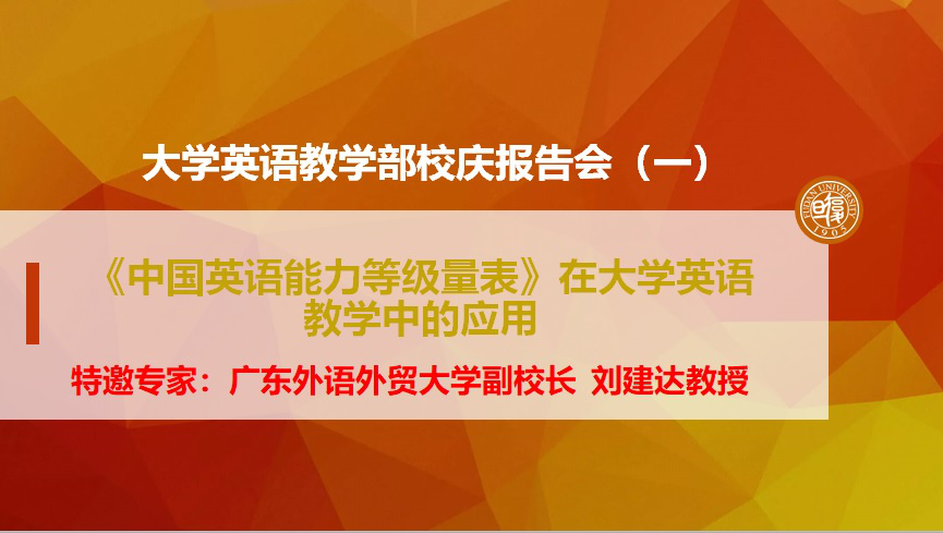 5月19日下午,大学英语教学部的首场2020年校庆报告会成功举办。广东外语外贸大学副校长刘建达教授应邀为大英部教师做了题为“《中国英语能力等级量表》在大学英语教学中的应用”的校庆学术报告。报告会由外文学院副院长、大学英语教学部主任范烨主持。