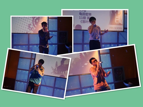 最后一位出场的选手是来自11级英语系的龟田宏幸。他浑厚温柔的声线把王力宏的《落叶归根》演绎得淋漓尽致,获得了满堂喝彩与所有两位还有剩余名额的导师的转身。经过了导师激烈的陈词,龟田宏幸最终选择加入了沈殷怡人老师的队伍,期待他决赛更精彩的表现!