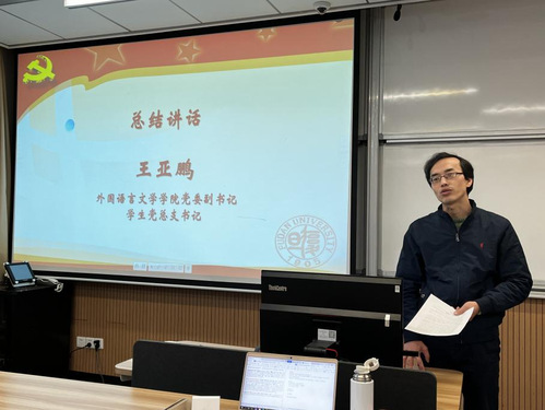2021年11月23日,外文学院2021年秋季入党积极分子培训班结业仪式在6107举行,本期全体入党积极分子参加了结业仪式。学院党委副书记、学生党总支书记王亚鹏出席。