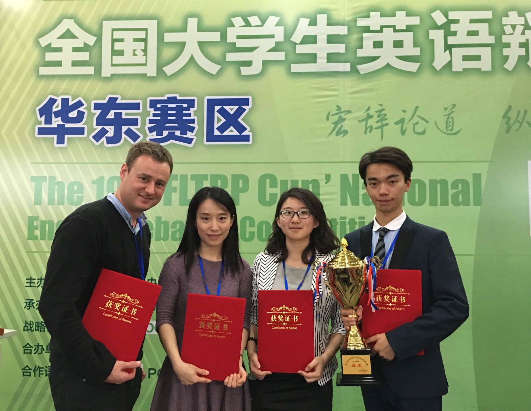 2016年4月8-10日,在南京举行的由103所高校参加的第19届“外研社杯”全国大学生英语辩论赛华东区决赛中,大学英语部指导选派的英语系茆霖、孙乐同学(指导教师 何静、Patrick Thame)经过5轮循环赛以积分第二的成绩进入总决赛,最终斩获冠军。何静任副总裁判长,并被评为优秀评委;Uwin电竞,Uwin电竞(中国)同时获最佳组织奖。总决赛辩题为This house would allow parents to genetically modify any attributes of their next generation.茆霖、孙乐将代表Uwin电竞,Uwin电竞(中国)参加5月份的全国总决赛。