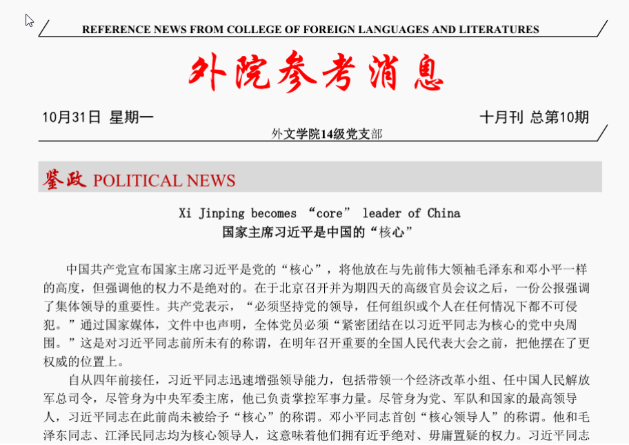 首先,高质量的党团建设引领着班集体的进步。支部重视党员自身的党性修养。党员同学定期参加读书报告会和“模拟新闻发布会”活动,并编辑独具外院特色的《外院参考消息》。《外院参考消息》已成为支部品牌,主要联系海外交流的同学编译海外主流媒体的涉华报道,力图使同学们在放眼世界的同时站稳中国立场。支部也注重开展实践活动。发动班级团员,携手外院大英部和学生发展中心,每学年定期开展“腾飞训练营”,得到了营员的较高评价。