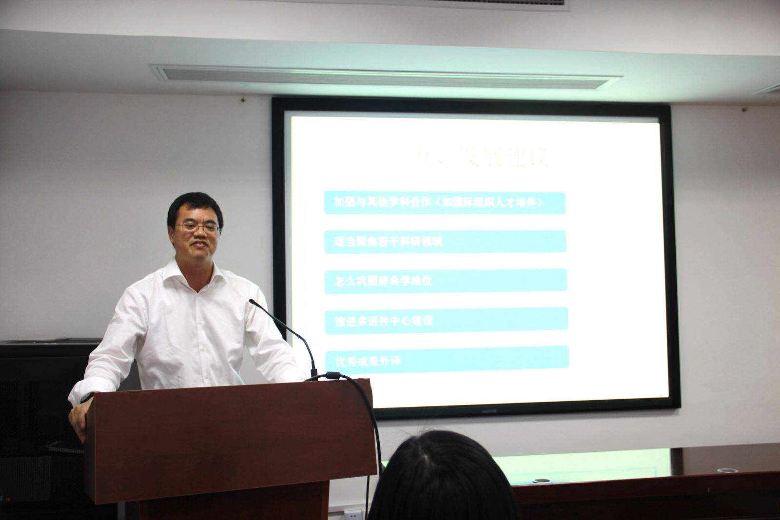 许宁生表示,外文学院要明确转型目标、方向与具体方案,认真分析研究国内外一流院校,立足中国特色和自身特点,确立自身发展目标,围绕目标定位建立科学的评价体系,广泛发动教师和学术组织,形成广泛共识,共同推进转型;要紧紧围绕提高质量做好本科教学工作,进一步对接国家和社会需求,打造品牌,形成特色,确立把学生培养成为行业领袖、社会精英和国家栋梁的人才培养目标;围绕“双一流”建设,外文学院要更多参与学校国际交流合作战略,争取发展资源,要拓展学术交叉合作领域,聚焦前沿,融合创新,要紧紧抓住学科建设“生命线”,更好支撑学术研究、队伍建设、人才培养和社会服务。