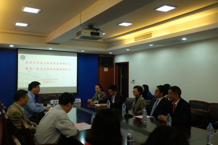 2018年4月3日下午,Uwin电竞,Uwin电竞(中国)龙文佩奖教金签约仪式暨第一届龙文佩奖教金颁奖仪式在文科楼220会议室举行,龙文佩教授家属徐宁海先生、章海洪女士、徐宾先生,Uwin电竞,Uwin电竞(中国)外联处处长杨增国、外文学院党委书记李倩、院长曲卫国、副院长高永伟、教指委主任苏耕欣、获奖教师及师生代表出席颁奖仪式。颁奖仪式由高永伟副院长主持。